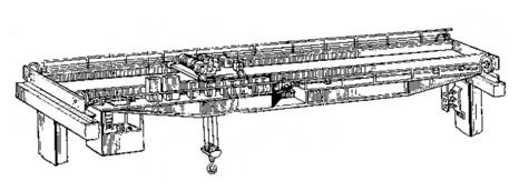 Мостовой кран (рис. 4.1) представляет собой мост, перемещающейся по крановым путям на ходовых колесах, которые установлены на концевых балках. Пути укладываются на подкрановые балки, опирающиеся на выступы верхней части колонны цеха. Механизм передвижения крана установлен на мосту крана. Управление всеми механизмами происходит из кабины прикрепленной к мосту крана. Питание электродвигателей осуществляется по цеховым троллеям. Для подвода электроэнергии применяют токосъемы скользящего типа, прикрепленные к металлоконструкции крана. В современных конструкциях мостовых кранов токопровод осуществляется с помощью гибкого кабеля. Привод ходовых колес осуществляется от электродвигателя через редуктор и трансмиссионный вал.
