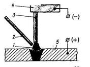 В 1802 г. русский физик В. В. Петров первым в мире открыл явление дугового разряда и возможность использовать его для расплавления металла. В 1882 г. русский инженер Н. Н. Бенардос изобрел способ дуговой сварки . с применением угольного электрода (рис. 1). Один провод электросварочной цепи присоединяется к свариваемому металлу 5, другой — к держателю 4 с угольным неплавящимся электродом 3. Чтобы образовать сварной шов или наплавленный слой, в дугу 1 вводят присадочный металлический пруток 2. Для сварки угольным электродом требуется только постоянный ток и применение присадочного прутка. Это усложняет процесс, и особенно широкого распространения такой вид сварки не получил. Его применяют при сварке чугуна, цветных металлов, при наплавке твердыми сплавами и электродуговой резке.