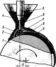 Сущность этого способа заключается в следующем. К дуге 7, образующейся между электродом 6 и поверхностью вращающейся детали 1 (рис. 5), через мундштук 5 специальным устройством (автоматом) непрерывно подается электродная проволока, а из бункера 4 слоем 50 .60 мм насыпается гранулированный флюс. Дуга, утопленная в массе флюса, горит под жидким слоем 2 расплавленного флюса в газовом пространстве 3. Жидкий слой 2 флюса надежно предохраняет расплавленный металл от окружающего воздуха, в большой степени уменьшает разбрызгивание металла, улучшает формирование шва 9, использование теплоты дуги и материала электродной проволоки