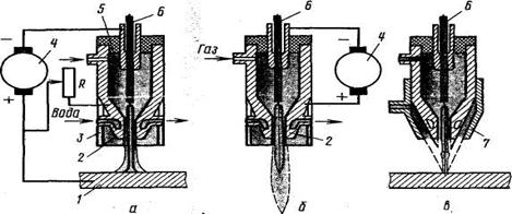 а — прямого действия; б — косвенного действия; в — микроплазменной; 1 — деталь; 2 — водоохлаждаемое сопло; 3 — газозащитное сопло; 4 — источник питания; 5 — камера для плазмообразующего газа; 6 — электрод; 7 — фокусирующее сопло.