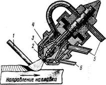 прутками твердых сплавов. Горелка при наплавке перемещается впереди прутка. Сварочная ванна защищается аргоном, подаваемым через канал 6.