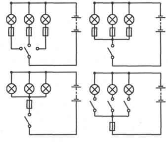 Используя выданные учителем потребители (лампы накаливания и др.), провода с клеммами, источник питания (гальваническую батарейку и др.), элементы управления (выключатель, переключатель) и защиты (предохранитель), начертите схему и выполните монтаж электрической цепи с параллельным соединением потребителей.