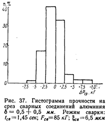 Гистограмма прочности сварных соединений при испытании на срез наглядно характеризует устойчивость процесса сварки (рис. 6). Подавляющее большинство образцов (более 95%) имеет разброс в прочности 5—10% от среднего значения разрушающей нагрузки Рср.