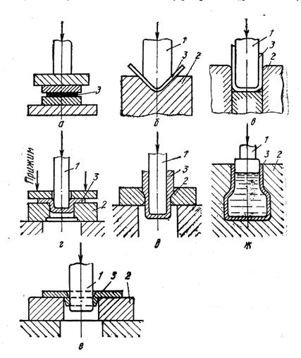 Формовка — изменение формы заготовки или полуфабриката посредством местных деформаций, например, увеличение диаметра средней части полой детали (рис. 4, ж). Раздачу средней части вытянутого стакана осуществляют с помощью резинового вкладыша или жидкости в разъемной матрице.