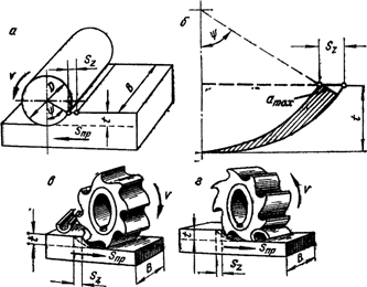 перемещение изделия за время поворота фрезы на угол между двумя соседними зубьями; Sо=SzZ — подачу на оборот или перемещение изделия за один оборот фрезы, где Z — число зубьев фрезы; Sмин=SzZn — минутную подачу или перемещение изделия за одну минуту; t — глубину резания — расстояние между обрабатываемой и обработанной поверхностями, измеренное в направлении, перпендикулярном оси вращения фрезы. Ширину фрезерования В измеряют в направлении, параллельном оси вращения фрезы.