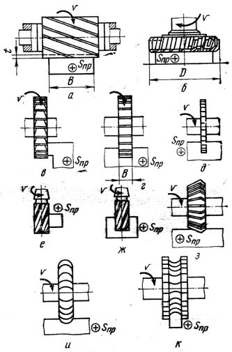Наиболее распространенные типы фрез и схемы обработки поверхностей заготовок на горизонтально- и вертикально-фрезерных станках показаны на рис. 6: цилиндрические (а); торцовые (б) для обработки плоскостей; дисковые (в-д); отрезные, прорезные для обработки уступов, пазов, разрезания; концевые фрезы (е, ж) для обработки уступов, плоскостей, пазов; угловые фрезы (з) для обработки канавок углового профиля; фасонные фрезы (и, к) для обработки фасонных поверхностей.