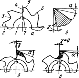 Фрезы изготавливают с остроконечными (рис. 7, б) и затылованными (рис. 7, в) зубьями. У последних спинка зуба — задняя поверхность — описывается по сложной кривой. Это делают для того, чтобы сохранить фасонный профиль режущих лезвий при последующих переточках фрезы. Переточку затылованных фрез проводят по передней поверхности. Однако в связи с тем, что износ зубьев фрез преобладает по задней поверхности, при переточках снимают значительный слой материала инструмента, что делает эти фрезы менее долговечными.