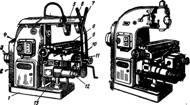 На горизонтальных направляющих консоли установлены поперечные салазки 11, поворотная плита 9, а в направляющих поворотной плиты продольный стол 8. Привод подачи размещен в консоли и состоит из электродвигателя 12 и коробки подач 13.