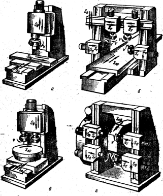На рис. 10, в, г показаны схемы карусельно-фрезерного и барабанно-фрезерного специальных станков. На этих станках торцовыми фрезами обрабатывают плоские поверхности заготовок в массовом и крупносерийном производстве.