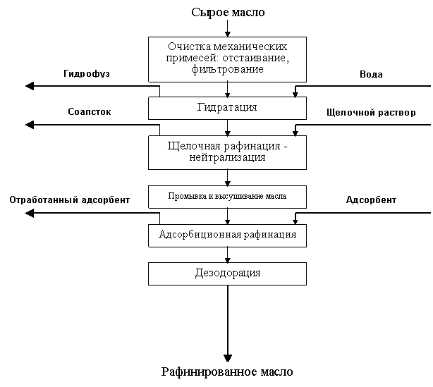 Для очищения масел от разнообразных примесей используется рафинация. Методы рафинации разделяют на физические, химические и физико-химические. Твердые частицы изымаются физическими методами. К ним относятся отстаивание, фильтрование и проводятся они при первичном очищении масла. Химические средства рафинации (гидратация и щелочная рафинация) служат для изъятия фосфолипидов, свободных жирных кислот. Физико-химические методы (адсорбционная рафинация и дезодорация) предназначенные для изъятия красящих, вкусовых и ароматных веществ.