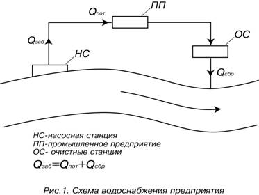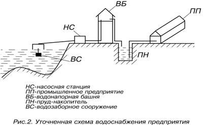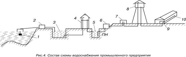 Исходя из основных показателей природных источников, затрат на подготовку и транспортировку воды и требований, предъявляемых к воде потребителями большинство предприятий используют для систем водоснабжения воду поверхностных источников с простейшей предварительной очисткой (фильтр на всасывании) или без очистки. В самом простом варианте схема водоснабжения предприятия может выглядеть следующим образом: