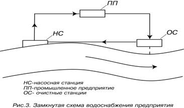 Расположение элементов системы водоснабжения на схеме, варианты их конструктивного исполнения, а также мощность зависят от характеристик предприятия и природного источника. Идеальным вариантом организации водоснабжения промышленного предприятия является внедрение бессточных схем (работа по замкнутому циклу) с минимальным потреблением внешних ресурсов и максимальным использованием ВЭРов и отходов производства.