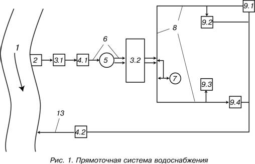 Вода из источника 1 через водозаборное сооружение 2 и насосную станцию 3.1 поступает в очистные сооружения 4.1, где осуществляется предварительная очистка воды до уровня, соответствующего технологическому процессу. Далее вода собирается в резервуаре чистой воды 5, конструкция и размеры которого определяются суммарной мощностью водопотребления предприятия (бак, башня, пруд и т.д.). Другое назначение РЧВ заключается в том, что с его помощью сглаживаются пиковые нагрузки в период наибольшего водопотребления. Далее по водоводам 6 с помощью насосной станции второго подъема 3.2 вода поступает в водопроводную сеть предприятия 8. Направление перетоков воды в схеме и коммутационные возможности сети зависят от технологии производства и могут быть различны для различных предприятий. По напорной сети предприятия вода направляется потребителям 9.1-9.4. Для поддержания необходимого напора и давления в сети служит водонапорная башня 7. Отработанная вода и ливневые воды, проходя через очистные сооружения 4.2 по сбросной линии 13 сбрасываются в источник.