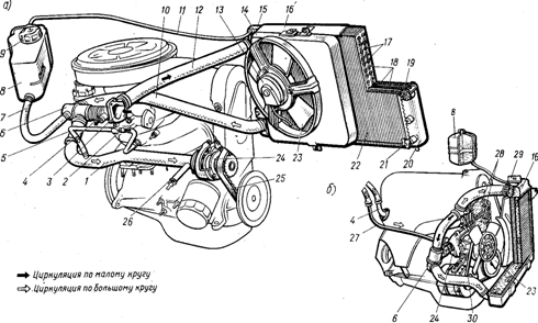 а—ВАЗ-2108; б—ВАЗ-2105; / — подводящая труба насоса; 2 — шланг отвода охлаждающей жидкости к карбюратору; 3 — выпускной патрубок головки цилиндров; 4 — патрубок подвода жидкости к отопителю; 5 и 27— шланги отвода жидкости соответственно от блока подогрева карбюратора и от отопителя; 6 — термостат; 7и 11 — шланги соответственно от бачка к термостату и от бачка к радиатору; 8 — расширительный бачок (компенсационный); 9 — пробка расширительного бачка; 10 и 12 — соответственно отводящий и подводящий шланги радиатора;