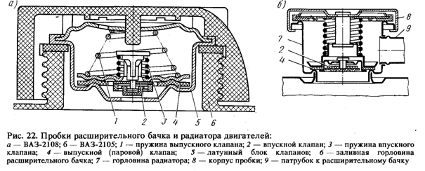 патрубок бачка шлангом 7 соединяется с дополнительным патрубком термостата 6. Заливная горловина бачка герметически закрыта пробкой (рис. 2). В пробке расширительного бачка помещаются два клапана: выпускной (паровой) клапан 4, который открывается при избыточном давлении в системе охлаждения до 20 кПа и выпускает часть паров в атмосферу; впускной клапан 2 (воздушный), который открывается при понижении давления в системе до 95 — 86 кПа (разрежение) вследствие остывания или слива жидкости и пропускает в систему охлаждения атмосферный воздух.