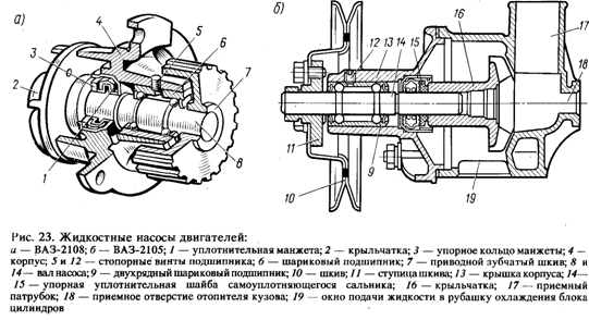 Привод насоса осуществляется зубчатым шкивом 18 при помощи ремня привода распределительного вала. Для предупреждения попадания охлаждающей жидкости в подшипник при повреждении манжеты (сальника) в корпусе насоса имеется отверстие, через которое жидкость вытекает наружу.