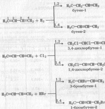Реакции присоединения. Присоединение водорода (гидрирование), галогенов (галогенирование), галогеноводородов (гидрогалогенирование) может протекать не только по месту одной или двух отдельных двойных связей (1,2-присоединение), но и к крайним углеродным атомам (1,4-рисоединение):
