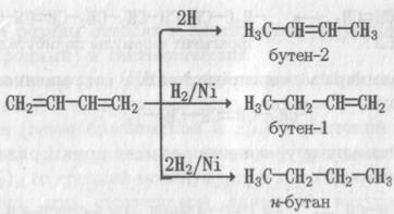 Выход продуктов 1,4- или 1,2-присоединения зависит от характера реагента и от условий проведения реакции. Например, водород в момент выделения (при взаимодействии цинка с соляной кислотой) присоединяется в положение 1,4, а газообразный водород (над катализатором Ni) - в положение 1,2 или гидрирует диен полностью до бутана: