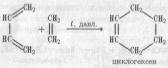 Диеновые синтезы. Этот вид реакций заключается в 1,4-присоединении нлконя или алкина (ацетиленового углеводорода) к диену С сопряженными двойными связями. Например: