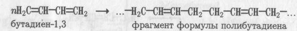 Реакции полимеризации. Диеновые углеводороды обладают исключительно важной особенностью: они легко вступают в реакции полимеризации с образованием каучукоподобных высокомоле кулярных продуктов. Реакции полимеризации протекают с присоеди нением молекул друг с другом в 1,4- или 1,2-положении, а также с одновременным присоединением в 1,4- и 1,2-положения. Вот как выг лядит фрагмент формулы продукта полимеризации дивинила (бута-диена-1,3), если присоединение молекул друг к другу идет в положе ние 1,4: