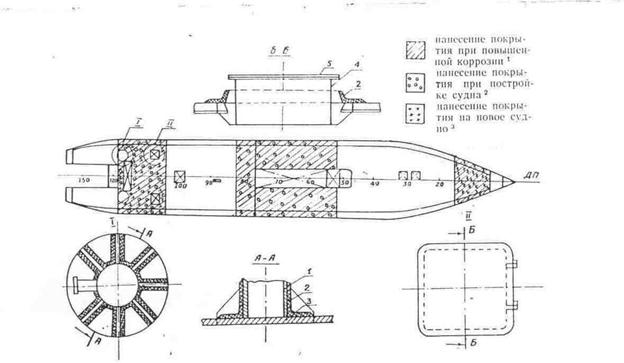 Отраслевой лабораторией эксплуатационной прочности промысловых судов разработан Атлас ремонта корпусных конструкций БМРТ типа «Маяковский», «Лесков» и РТМ типа «Тропик», «Атлантик» с применением стеклопластика *. В Атласе дана оценка конструктивных схем ремонта металлических корпусных конструкций с точки зрения восприятия ими возможных эксплуатационных нагрузок. Кроме того, приведены схемы нанесения стеклопластика на конструкции, поврежденные коррозией, и в профилактических целях, т.е. указан комплекс работ, который может снизить (или ликвидировать вообще) затраты, связанные с восстановлением поврежденных коррозией мест.