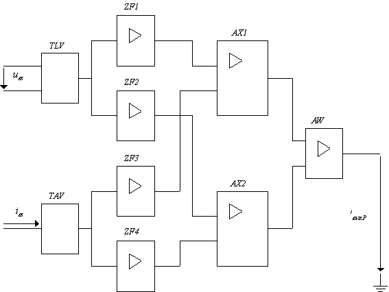 1. на двух интегральных перемножителях АХ1, АХ2 с входными ZF1, ZF2, ZF3, ZF4 частотными фильтрами и сумматором AW.