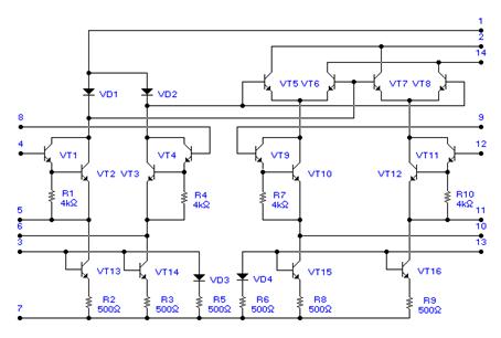 Перекрестные связи коллекторов этих транзисторов обеспечивают инверсию сигналов, необходимую для четырехквадрантного умножения. Входные каскады на транзисторах