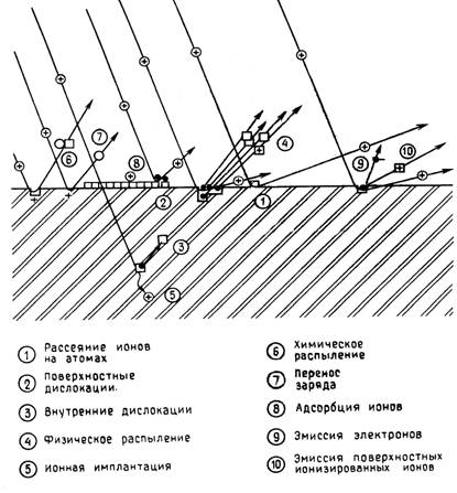 Импульс иона может быть достаточно велик для того, чтобы сместить поверхностный атом из положения, где он слабо связан с кристаллической структурой образца, в положение, где связь оказывается сильнее (2). Этот процесс называется атомной дислокацией. Ионы с более высокими энергиями могут вызывать внутренние дислокации в толще образца (3). Если соударяющиеся с поверхностью образца ионы передают настолько большой импульс, что полностью освобождают от связей один или несколько атомов, происходит физическое распыление (4). Ионы могут проникать в кристаллическую решетку и захватываться там, израсходовав свою энергию (ионная имплантация) (5) . В результате химических реакций ионов с поверхностными атомами на поверхности образуются новые химические соединения, причем самый верхний слой атомов может оказаться в газообразном состоянии и испариться (химическое распыление) (6). Бомбардирующие положительные ионы в результате процессса оже-нейтрализации могут приобретать на поверхности электроны и отражаться от нее в виде нейтральных атомов (7). Ионы могут оказаться связанными с поверхностью образца (адсорбированными) (8). При ионной бомбардировке металлических поверхностей в определенных условиях возможно возникновение вторичной электронной змиссии (9). Наконец, если поверхностные атомы возбуждаются до ионизированных состояний и покидают образец, имеет место вторичная ионная эмиссия (10).