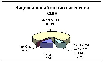 На данный момент 3/4 всего населения - американцы США. Около 0,4% населения - аборигены (индейцы и эскимосы), большая часть которых продолжает жить в резервациях, созданных правительством на ранних этапах колонизации. Свыше 12% американцев - негры, которые вплоть до 30-х гг. XX века, как и во времена рабства, были заняты преимущественно в сельском хозяйстве южных штатов. Теперь большинство негров живет в городах, где выполняет неквалифицированную работу в промышленности и сфере обслуживания (грузчики, лифтеры, прислуга и т.п.).