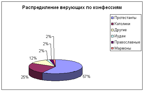 Разнообразен и религиозный состав населения. В США зарегистрировано около 260 различных церквей, в том числе 86 насчитывают более 50 тыс. последователей каждая. Религиозная принадлежность американцев, как правило, тесно связана с их происхождением: потомки выходцев из Италии, Испании, Польши обычно католики, из Великобритании, Скандинавских стран - протестанты, из России, Греции - православные (хотя их доля значительно ниже католиков и протестантов).