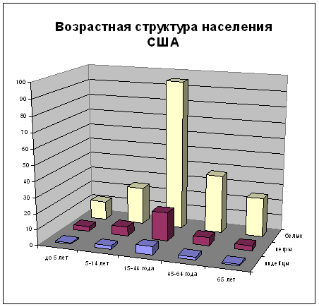 Возрастную и половую структуру населения США можно оценить по приведенным ниже диаграммам, которые составлялись по данным 1986 года. Общая численность населения тогда составляла 241,5 млн. человек (без учета военнослужащих и других граждан США за пределами территории 50 штатов страны).