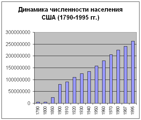 Динамику численности населения США (в тыс. человек) за 1790 - 1987 гг. мы можем видеть на следующей диаграмме.
