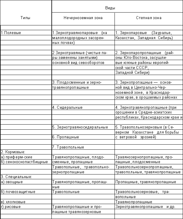 Каждый из рассмотренных типов севооборотов в зависимости от соотношения в структуре посева основных групп сельскохозяйственных культур (зерновые, травы, пропашные и др.) и способов восстановления плодородия почвы подразделяется на различные виды, соответствующие местным природно-экономическим условиям.