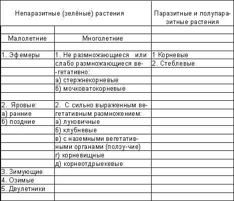 Сорные растения делят по их биологическим признакам: способу питания, продолжительности жизни, способу размножения. По способу питания сорняки разделяются на паразитные (незеленые растения) и непаразитные (зеленые растения) (табл. 12).