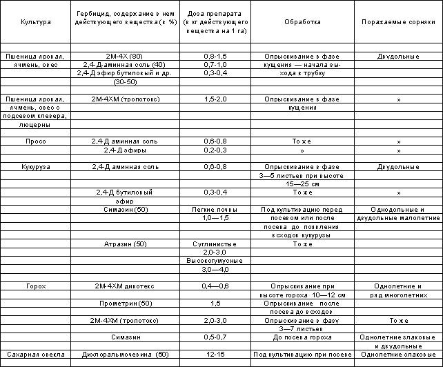 Химический метод—это уничтожение сорняков гербицидами. По характеру поражения растений различают гербициды сплошного и избирательного действия. Первые уничтожают все растения, вторые — только определенные виды сорняков. В зависимости от природы действия на расстения избирательные гербициды делятся на контактные, вызывающие отмирание тканей растений в местах нанесения раствора гербицида, системные, или передвигающиеся, которые оказывают на растение глубокое токсическое действие, проникая и в надземную часть, и в корни (табл. 14).