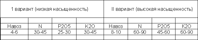 (навоз - в т на 1 га, минеральные удобрения - в кг действующего