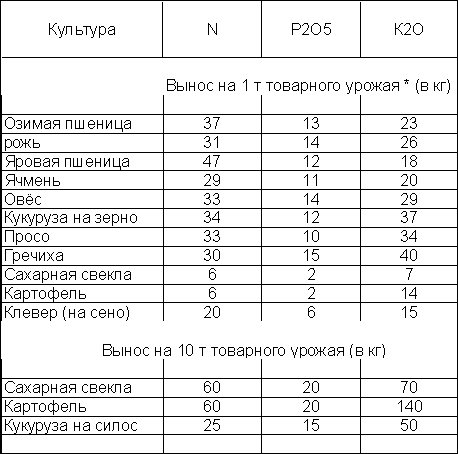 * Вынос приводится на 1 т товарного урожая зерна, сена и на 10т корне-клубнеплодов и силосной массы с соответствующим количеством нетоварной массы (соломы, ботвы и пр.). Данные по выносу могут значительно отклоняться от указанных средних величин.