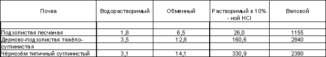Формы калия в подзолистых и черноземных почвах (в мг К2О на 100 г почвы) (по В. У. Пчёлкину)