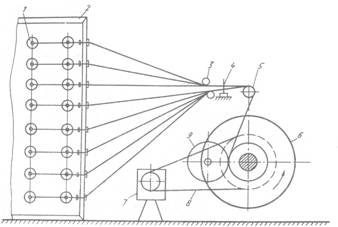 Исследования и опыт работы предприятий показали, что более распространенным является прерывный вид снования. Изучение начинают с ознакомления со схемой процесса снования.