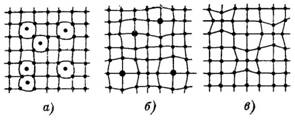 Как показано на рис. 2-5, твердые растворы могут быть типа внедрения (а) и типа замещения (б и в), причем на рис. 2-5,б приведен вариант, когда замещающие атомы крупнее, чем атомы основного компонента, а на рис. 2-5,в — вариант, когда замещающие атомы меньше. Однако во всех случаях из-за того, что в твердом растворе находятся атомы разного размера, ячейка основного компонента деформируется. Следовательно, размер ячейки, о котором говорится в правиле Вегарда, в целом представляет собой среднюю величину.