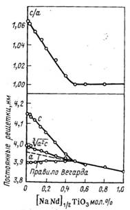 На рис. 2-6 показано, как изменяются постоянные решетки у керамики в системе PbTiO3—(NaNd)1/2TiO3) измеренные Сакада. При большом количестве РbTiO3 происходит некоторое отклонение от правила Вегарда, но в общем оно, как видно, соблюдается.