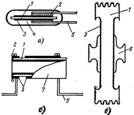 а – дисковый; б – трубчатый; в – конденсатор большой мощности; 1 – керамический диэлектрик; 2 – нанесенный припой; 3 - серебряный электрод; 4 — влагозащитное покрытие погружением; 5 - вывод; 6 – вывод; 7 — влагозащитное покрытие.