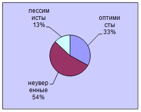 · пессимисты – респонденты, ответившие «совсем не уверен» (13%, 15 человек). Наиболее часто такой вариант ответа встречался в группе от 45 до 54 лет. Для респондентов данной группы характерен низкий уровень социального оптимизма. Им свойственна неуверенность в собственных силах, возможно заниженная самооценка. Преобладание в планах этих респондентов на будущее нацеленности на отдых и поддержание существующего положения вещей позволяет сделать вывод о некоторой социальной аморфности представителей данной группы.