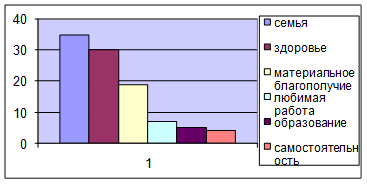 Также респондентам было предложено проранжировать наиболее значимые жизненные ценности. Наиболее часто упоминаемыми среди опрошенных ценностями стали следующие: «семью» - 35%, «здоровье» - 30% и «материальное благосостояние» - 19% упоминаний. Такие ценности как любимая работа, образование и самостоятельность отмечались сравнительно редко - 7%, 5% и 4% упоминаний соответственно. Исходя из ответов, данных респондентами на поставленный вопрос можно сделать вывод, что наибольшее значение для них имеют традиционные ценности. Материальные ценности, хотя и признаются немаловажными доминирующей роли не играют.