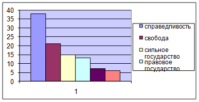 Изучение предпочтений в сегменте демократических ценностей показало, что большинство опрошенных выбирают справедливость (38%) и свободу (21%), исходя из чего, можно сделать вывод, что в социально-политических установках респондентов преобладают либеральные ценности. Далее по частоте упоминания следуют такие ценности как сильное государство (15%) и правовое государство (13%). Эти ответы были наиболее популярны у респондентов в возрасте 45-54 лет, т.е. в данной группе довольно высока доля людей, предпочитающих твёрдый порядок свободе и демократии, что позволяет сделать вывод об их склонности к авторитарной власти. Наиболее редко назывались такие демократические ценности как независимость (7%) и равенство (6%).