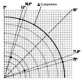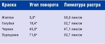 Соединение узловых точек в пределах четверти круга показывает, что точки пересечения для углов 0 и 45° смещены относительно углов 18,4 и 71,6°. Это приводит к различным частотам растровых структур цветоделенных изображений, что показано в табл. 1.