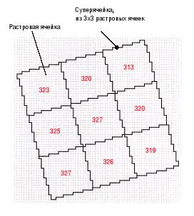 Рис. 5 Несколько растровых ячеек (3х3), объединенных в суперячейку. Цифры указывают на число пикселей в ячейке