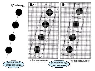 Фирма Linotype-Hell развила принцип суперячейки и назвала его "иррациональным" растрированием. Данная технология использует те углы поворота и линиатуры растров, которые уже доказали оптимальное качество для ранних моделей фирменных репросканеров Hell. Главное отличие методов "рационального" и "иррационального" растрирования заключается в разнице между рациональными и иррациональными числами. Основой "иррационального" растрирования служит матрица, в которой расстояние между центрами растровых точек точно соответствует некоторому определенному значению, например, 166,66 мкм при линиатуре 60 лин/см. Метод "иррационального" растрирования удовлетворяет также требованиям установки идеальных углов поворота, но при этом форма растровой точки периодически изменяется из-за изменения порядка чередования пикселей. Например, через три или четыре пикселя по вертикали и один пиксель по горизонтали (рис. 8).