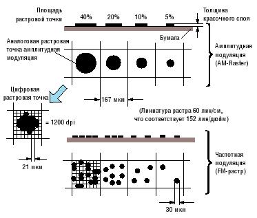 Рис. 8 Частотно-модулированное растрирование (FM) в сравнении с амплитудно-модулированным растрированием (АМ) с цифровой структурой растровой точки