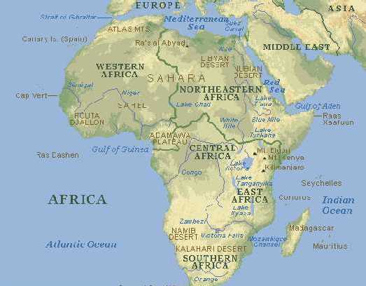 · Для Африканского континента характерен равнинный рельеф, с несколькими горными цепями и узкой прибрежной плоскостью. Континент обычно разделяют вдоль линий пустыни Сахара , самой большой пустыни в мире, которая занимает огромную часть северной половины континента. Страны к северу от пустыни Сахара составляют область Северной Африки, и включают такие большие и густонаселенные государства как Египет и Алжир. Вообще, эти народы больше изучены чем страны на юге, частично благодаря тому, что здесь протекает Нил, самая длинная река в мире. Большинство населения Африки живет в области к югу от Пустыни Сахара, известной как Африка района Сахары. В этой области, восточная Африка включает такие страны как Эфиопия, Сомали, и Уганда. Среди народов Центральной и Западной Африки - Ангола, Камерун, Гана, Нигерия и Демократическая республика Конго (прежде Заир). Южная Африка включает Ботсвану, Лесото и Намибию. Африка также охватывает много островов, самым большим из которых является Мадагаскар, расположенный к юго-востоку от континента. В целом, Африка охватывает приблизительно 50 стран, от Нигерии (со 127 миллионами людей) до маленьких островных республик типа Comoros (с населением около 500,000).